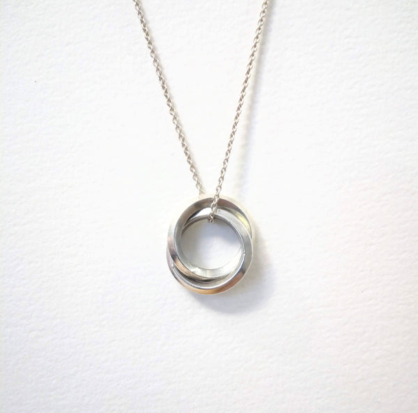 Enhance your jewelry collection with our intertwined sterling silver loops necklace. The two loops, like a binary star system, orbit one another to create a beautiful and eye-catching design that is both unique and stylish.