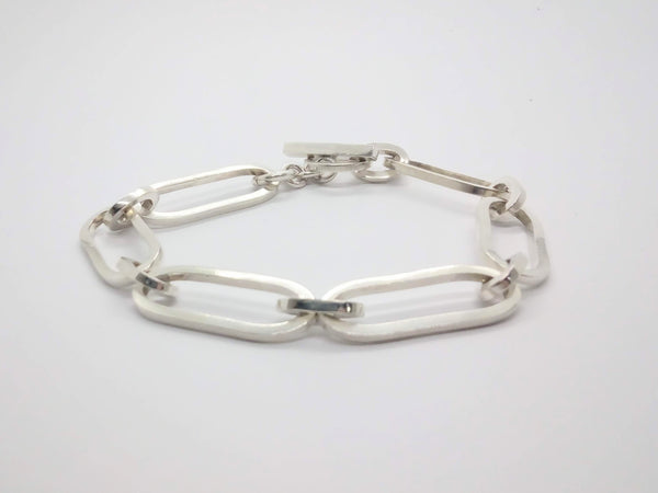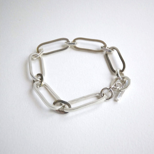 Modern and stylish contemporary sterling silver chunky bracelet. It is designed with elongated oval loops, joined by small oval loops. Finished with a toggle bar closure.